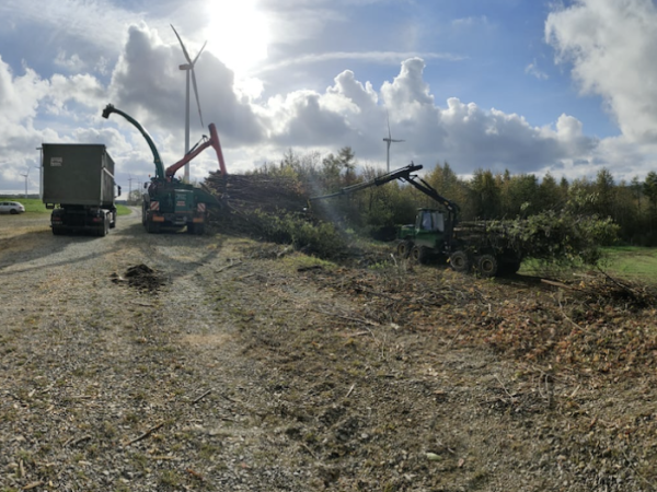 Hier werden jung Bäume in einem Alter von 10-20 Jahren komplett aus dem Bestand entnommen. Mittels Fällgriefer wird der Baum gefällt und in dem Rungenkorb des Rückezuges abgelegt und so bald dieser voll ist, wird er dann am Waldrand entladen. Die geernteten Bäume werden dann von einem Großhacker gehackt und zu Hackschnitzel verarbeitet.