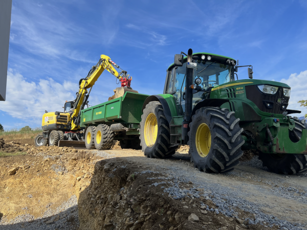 Mit unserem John Deere M6125 und einer Erdmulde von Pronar, können wir leichte und auch schwere Güter transportieren.